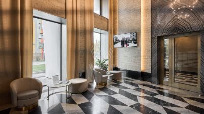 Главное о доме. Wellton Towers — три башни в Хорошёво-Мнёвниках со ступенчатым силуэтом и панорамными окнами. Архитектура складывает яркий акцент на Карамышевской набережной: вертикали, светлая облицовка и крупный ритм остекления. В лобби — высокий потолок, камень, латунные детали, стойка ресепшн и мягкие зоны для встреч. На стилобате устроили дворы без машин, детские и спортивные площадки, прогулочные маршруты. Первый уровень заняли кафе и повседневные сервисы. Многоуровневый паркинг соединяется с корпусами на лифте.