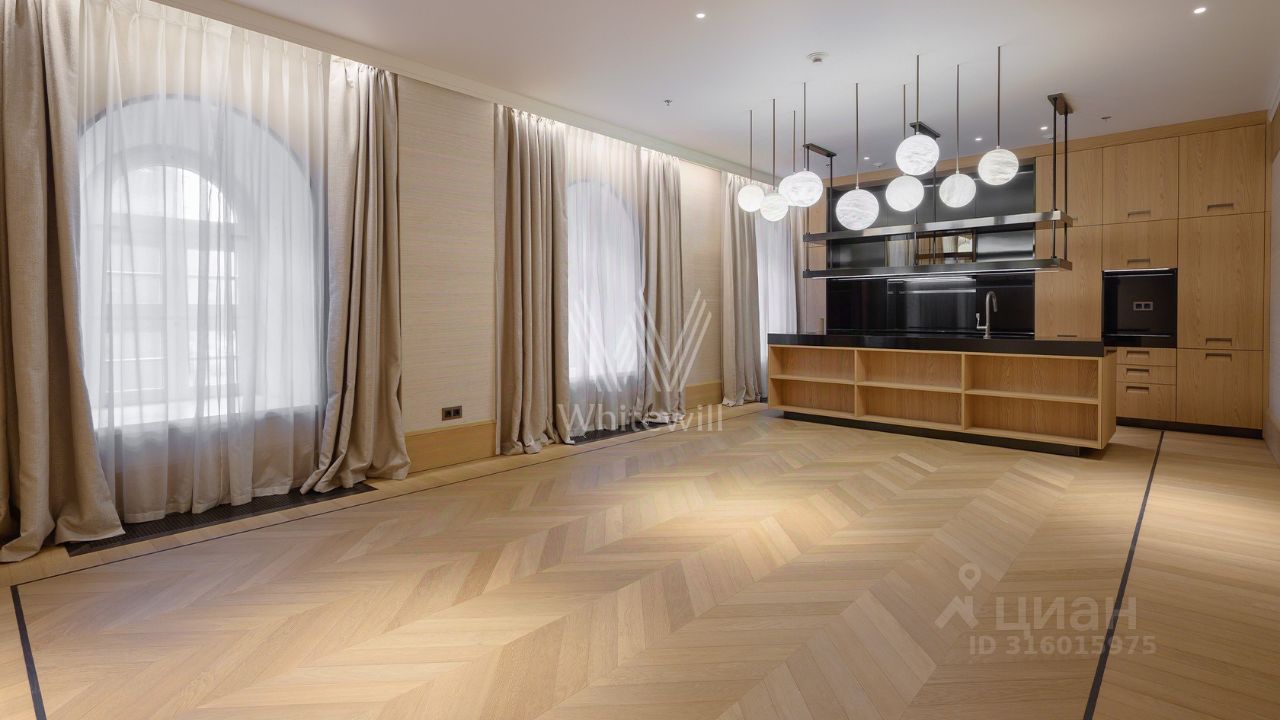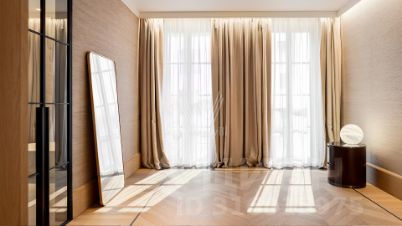 Квартира укомплектована необходимой бытовой техникой. Функциональная планировка включает кухню-гостиную, спальню со своей ванной комнатой и выходом на балкон, гостевой санузел, две гардеробные, постирочную и холл. Окна ориентированы на две стороны, открываются виды на Большую Никитскую улицу и во внутренний двор. В стоимость включено машино-место в подземном паркинге и кладовая.