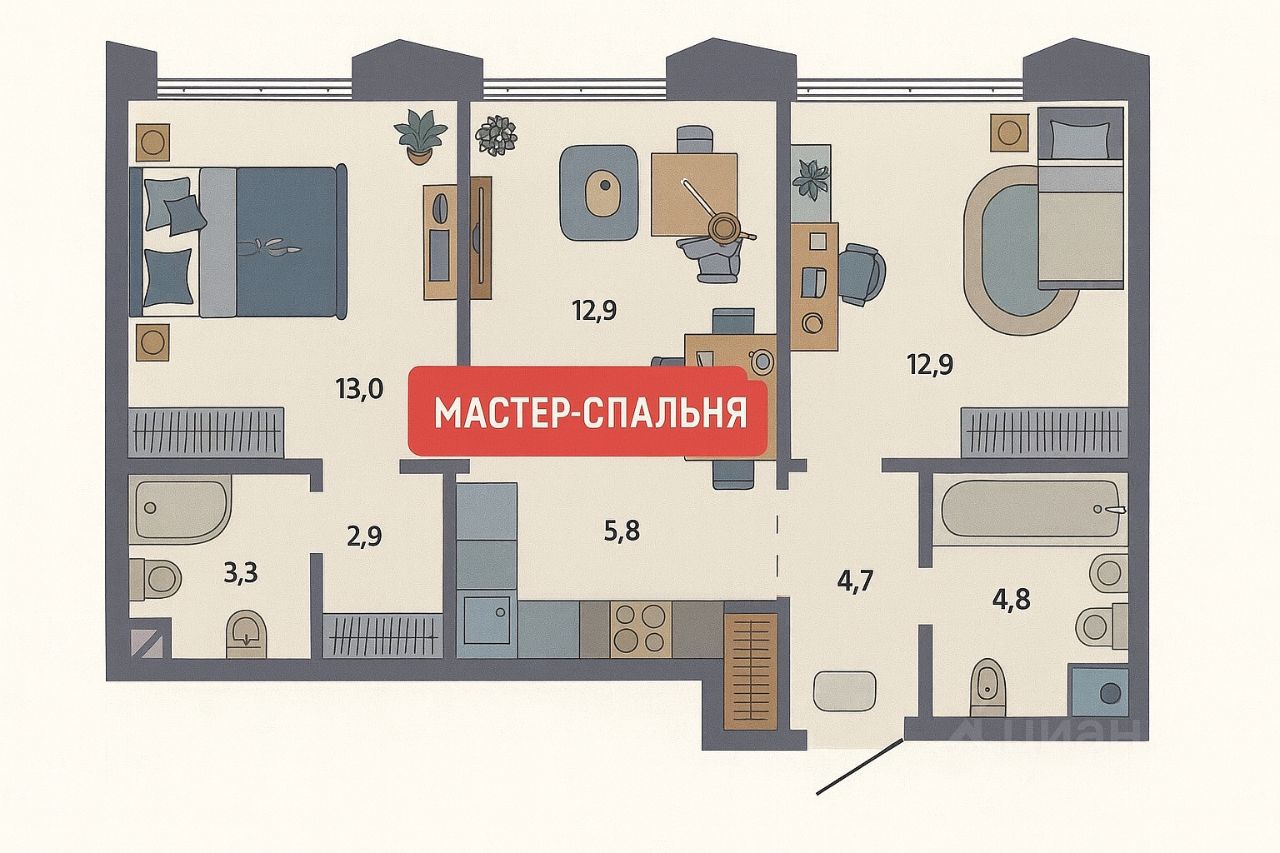 ТОП-планировка | Мастер-спальня | Гардеробная | 2 санузла | Прачечная | Метро — 2 минуты