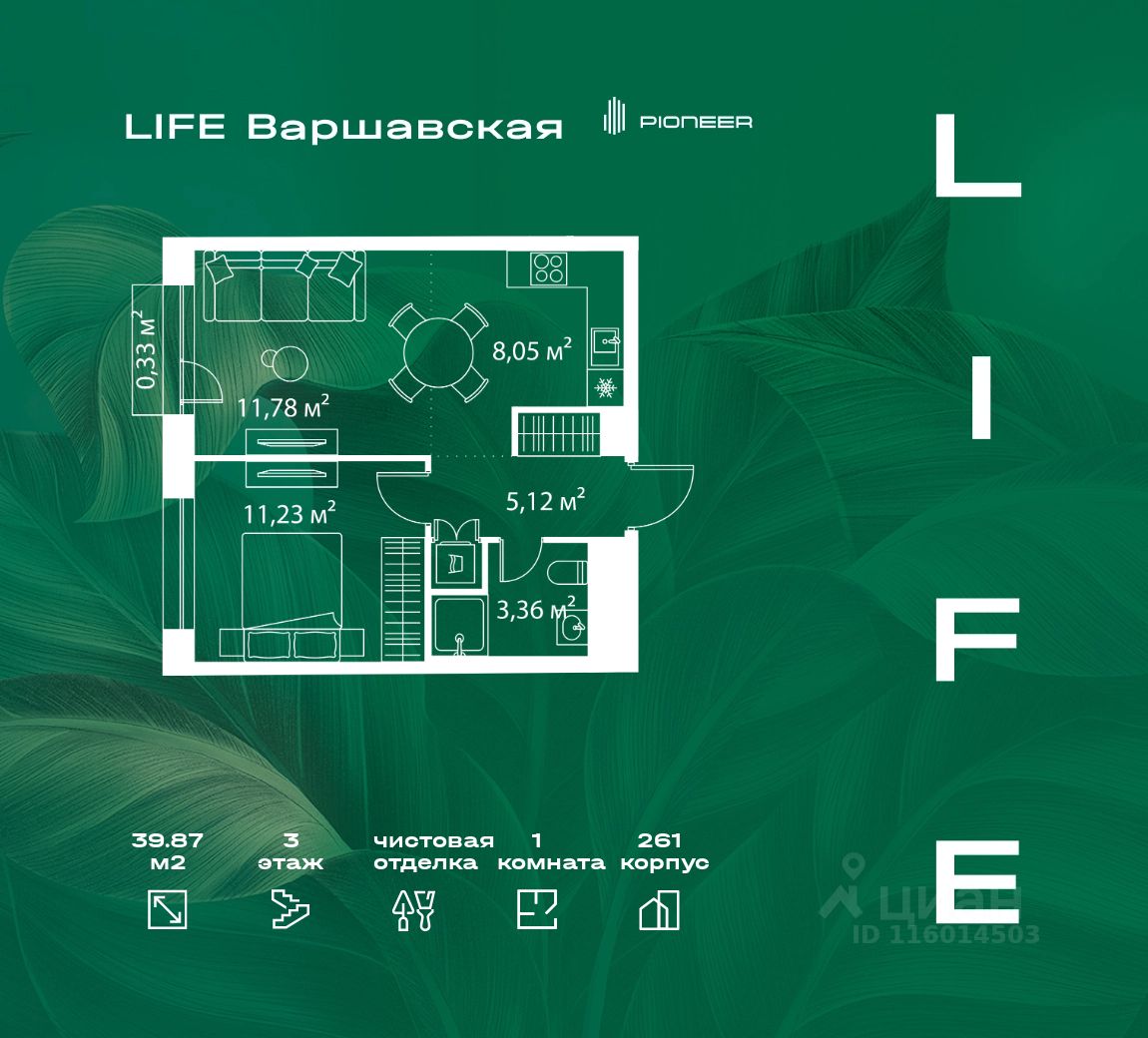 В районе Москворечье-Сабурово продается 1-комнатная квартира площадью 39.87 м². Она расположена на 3 этаже в 261 корпусе нового жилого квартала LIFE Варшавская.