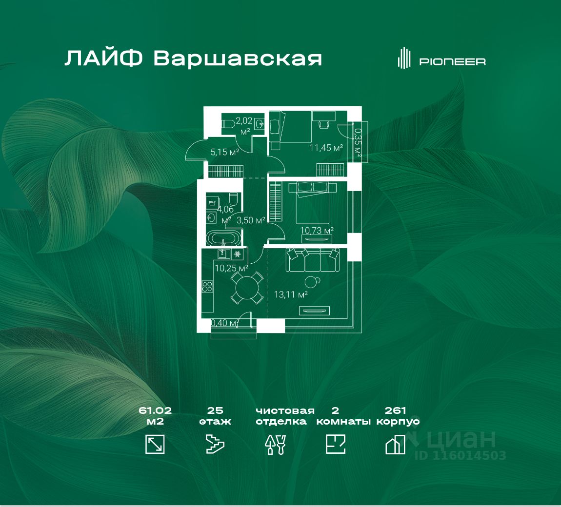 В районе Москворечье-Сабурово продается 2-комнатная квартира площадью 61.02 м². Она расположена на 25 этаже в 261 корпусе нового жилого квартала Лайф Варшавская.