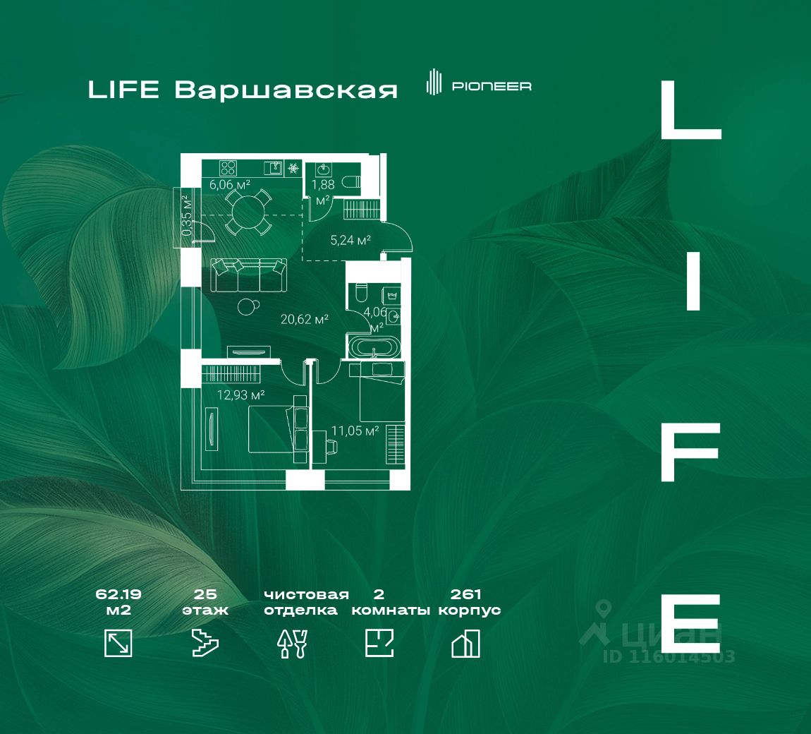 В районе Москворечье-Сабурово продается 2-комнатная квартира площадью 62.19 м². Она расположена на 25 этаже в 261 корпусе нового жилого квартала LIFE Варшавская.