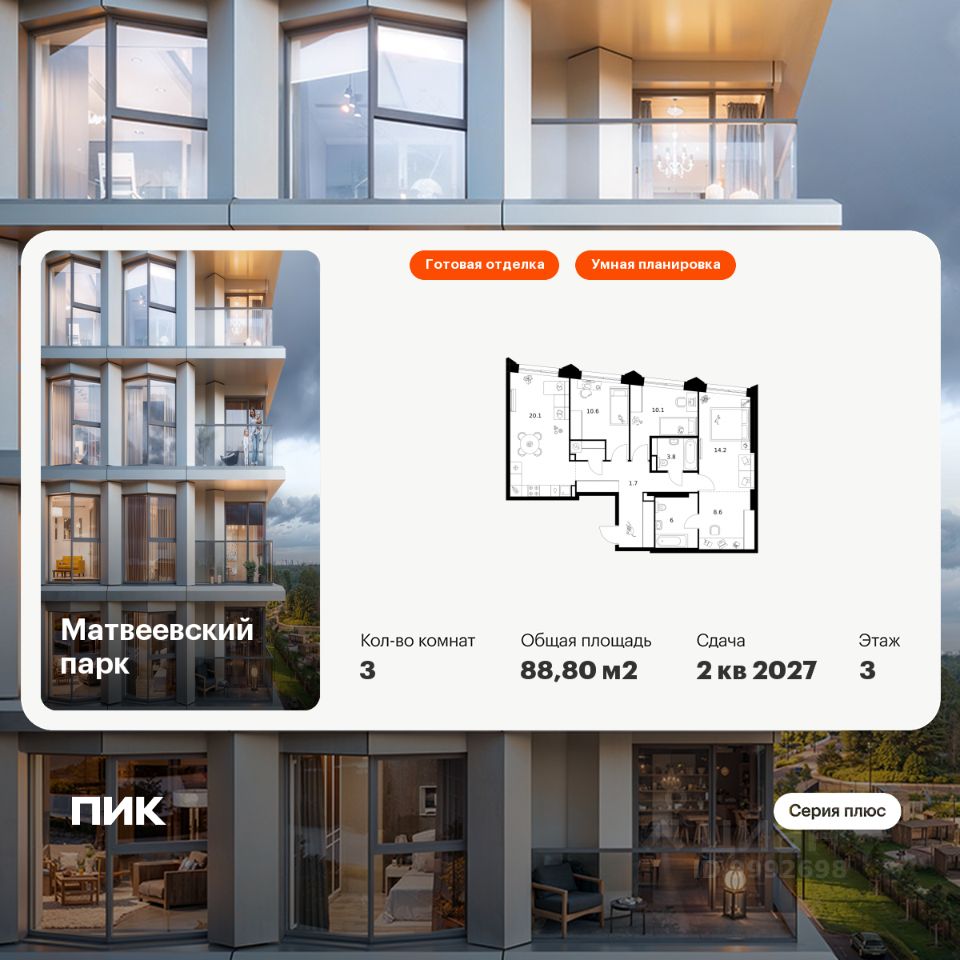 Продаётся 3-комн. квартира площадью 88,8 кв.м на 3 этаже 26 этажного дома (Корпус 4.1, Секция 1) проекта ПИК Матвеевский парк. Светлый просторный подъезд на уровне земли, функциональная планировка, большие окна, c отделкой.