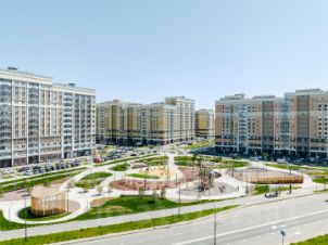 В квартале — монолитные дома комфортной высоты, от 10 этажей. Светлые фасады украшают кирпичные вставки в теплых природных оттенках.