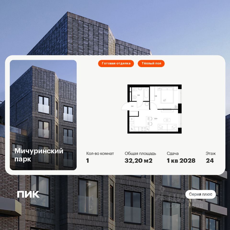 Продаётся 1-комн. квартира площадью 32,2 кв.м на 24 этаже 31 этажного дома (Корпус 4.3, Секция 2) проекта ПИК Мичуринский парк. Светлый просторный подъезд на уровне земли, функциональная планировка, большие окна, c отделкой.