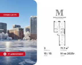 Продаётся 3-к квартира 71,7 кв.м. в ЖК "Михалковский" на 15-м этаже 15 этажного дома.
