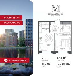Продаётся 2-к квартира 37,4 кв.м. в ЖК "Михалковский" на 15-м этаже 15 этажного дома.
