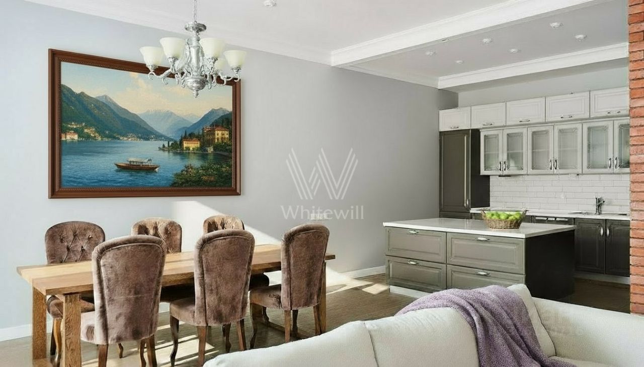 Выполнена авторская отделка в стиле современной классики. Основной акцент в оформлении создает кирпичная кладка. Многоуровневые потолки украшают дизайнерские люстры. Установлена система индивидуального кондиционирования.