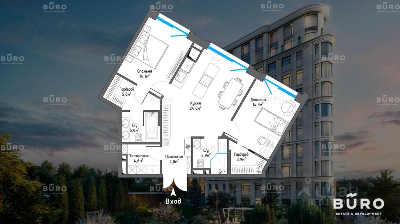 Оригинальная планировка предполагает просторную кухню-гостиную (24 кв. м), две спальни, два санузла и холл. Квартира без ремонта, что позволит вам реализовать все свои идеи по созданию красивого интерьера.