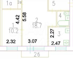 4 этаж: 4/5 эт., общая площадь 43,1 кв. м, есть балкон: кухня 6 кв. м, комнаты 18,7 и 10,2 кв. м.
