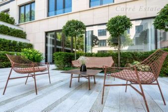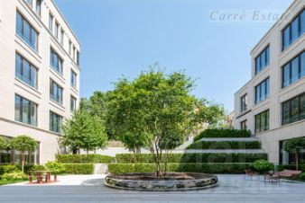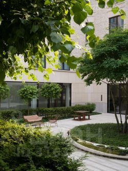 Территорию камерного сада Carre Blanc украсили, привезенные из Германии липы, редкие клены и декоративные яблони. В центре сада разместилась 5-ти метровая ирга. Продуманное зонирование создает ощущение приватности в самом центре столицы.