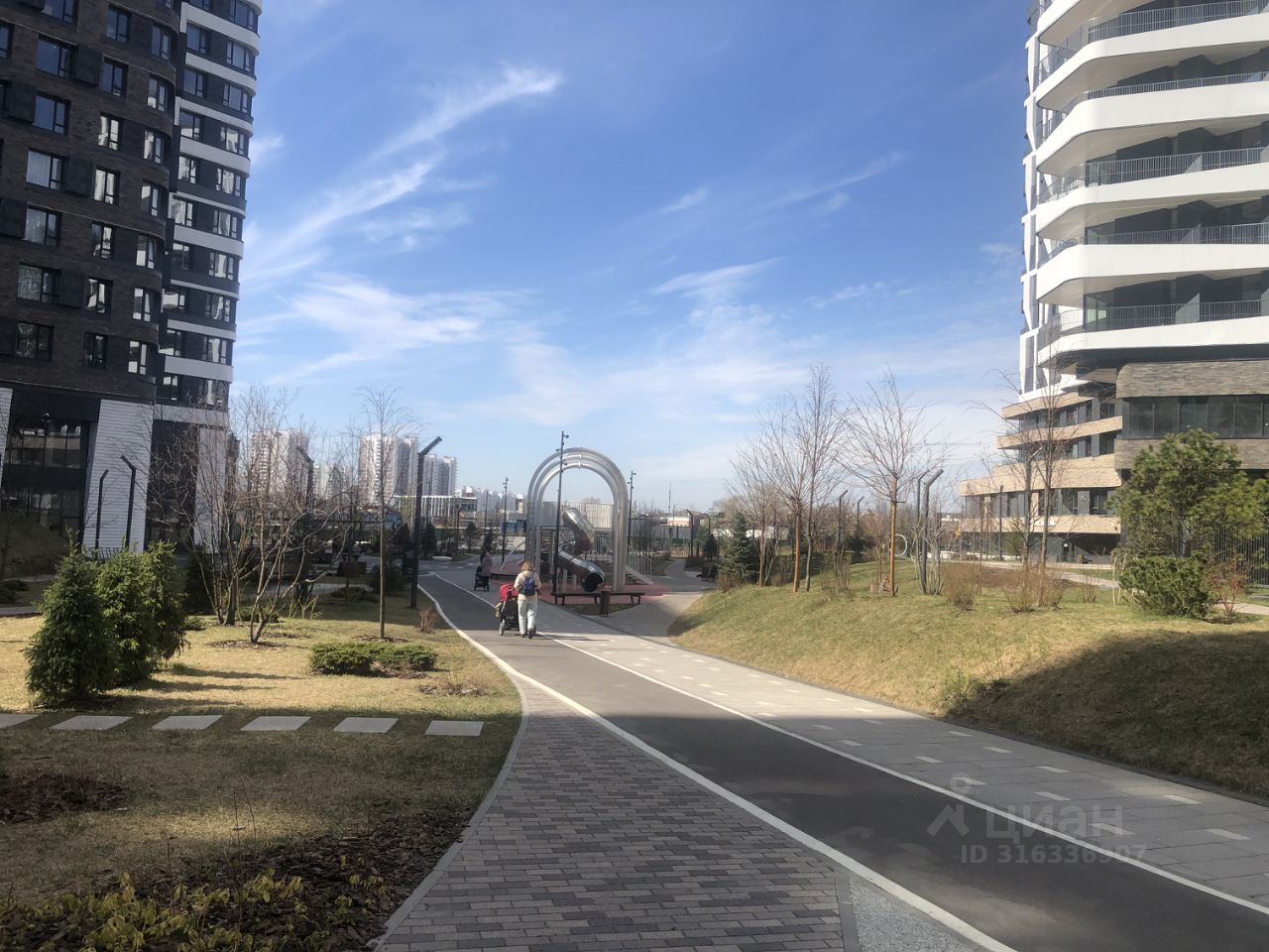 Огороженная охраняемая территория с детскими площадками и прогулочными зонами.