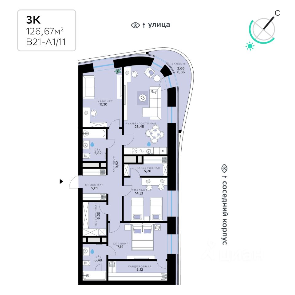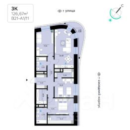 В продаже — трехкомнатная квартира с чистовой отделкой, общей площадью 126,67 кв. м. Квартира расположена на четвертом этаже одинадцатиэтажной секции корпуса класса Адвансд в новом районе СберСити, который строит Сбер. Дом находится на второй береговой линии Москвы-реки.