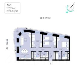 В продаже — трехкомнатная квартира с чистовой отделкой, общей площадью 117,75 кв. м. Квартира расположена на седьмом этаже одинадцатиэтажной секции корпуса класса Адвансд в новом районе СберСити, который строит Сбер. Дом находится на второй береговой линии Москвы-реки.