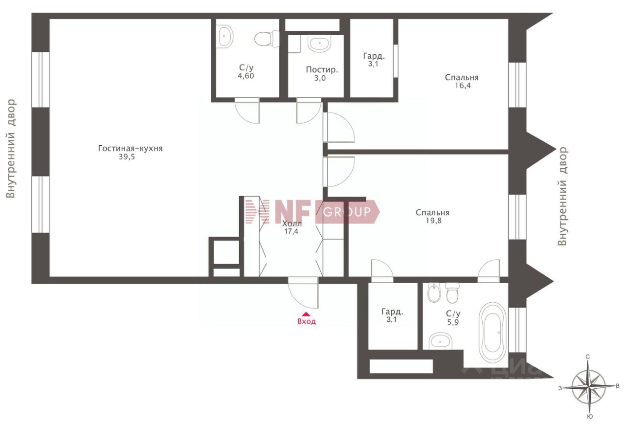 Планировка: гостиная-столовая с зоной кухни, мастер-спальня с собственными ванной комнатой с окном и гардеробной, вторая спальня с гардеробной, гостевой санузел, постирочная.