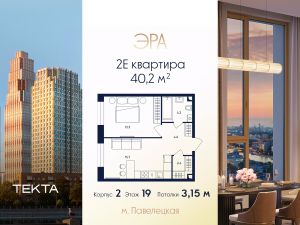 2-комн. квартира в ЖК "ЭРА" на 19 этаже в 33 этажном здании Корпус 2. Общая площадь: 40.2 кв.м., жилая: 23.50 кв.м. Высота потолков 3.15 м.