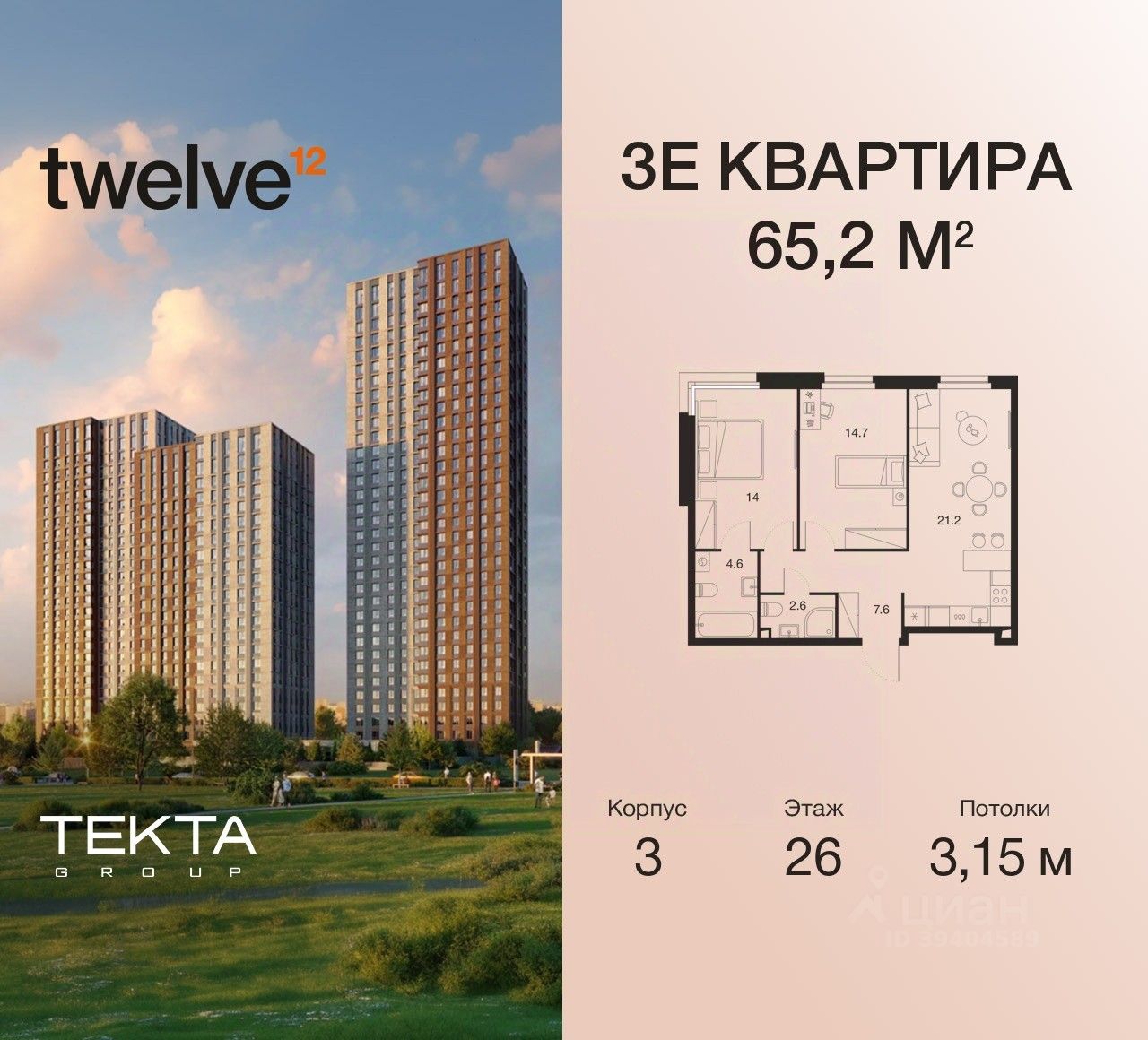 3-комн. квартира в ЖК "Twelve" на 26 этаже в 28 этажном здании Корпус 3. Общая площадь: 65.2 кв.м., жилая: 42.70 кв.м. Высота потолков 3.15 м.