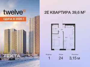 2-комн. квартира в ЖК "Твелв" на 24 этаже в 34 этажном здании Корпус 1. Общая площадь: 39.6 кв.м., жилая: 23.80 кв.м. Высота потолков 3.15 м.