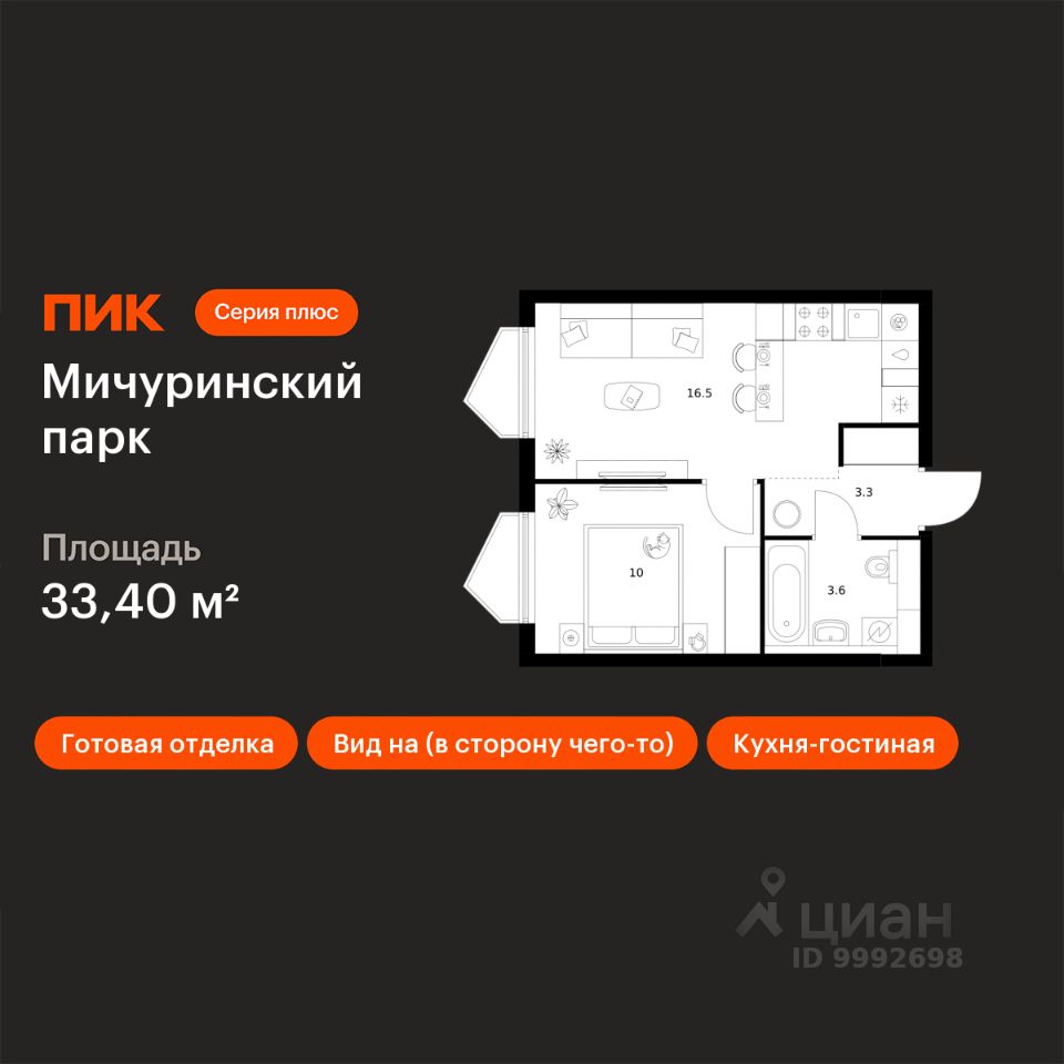 Продаётся 1-комн. квартира площадью 33,4 кв.м на 23 этаже 32 этажного дома (Корпус 4.5, Секция 2) проекта ПИК Мичуринский парк. Светлый просторный подъезд на уровне земли, функциональная планировка, большие окна, c отделкой.