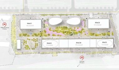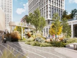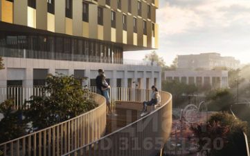 Двухуровневое благоустройство (второй уровень стилобат) с парящим мостом, детскими и спортивными площадками, зонами для отдыха и общения и центральной площадью, разработанное архитектурным бюро Kleinewelt Architekten, является продолжением общей концепции комплекса.