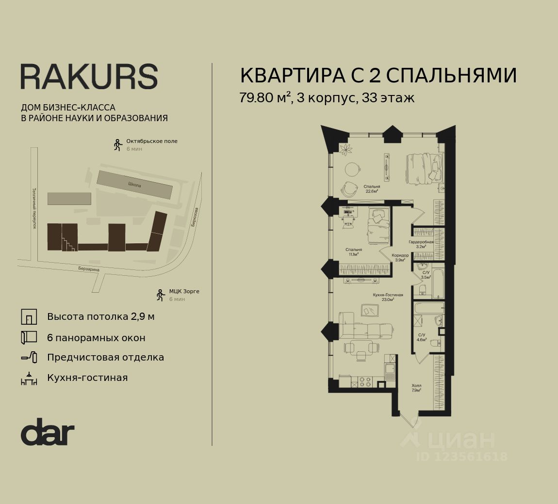 Продаётся 2-комнатная квартира 79.80 м² в жилом комплексе Ракурс. Квартиру отличают панорамное остекление, потолки 2,9 м, улучшенная шумо и воздухоизоляция. Дом сдаётся в 1 квартале 2028 года, продажи проходят через эскроусчета. Подземный паркинг, коворкинг, закрытая благоустроенная территория с фонтаном и артобъектами. Гибкие условия покупки. Rakurs — место, в котором жизнь приглашает к исследованию. Концепция проекта knowledge-centric среда, которая выражается здесь в образе жизни: • атмосфере интеллектуальной среды, • доступности образования, • фокусе на возможности для развития. RAKURS разместился в районе науки и окружен исследовательскими институтами и образовательными учреждениями, при этом на территории построена своя школа с уникальной концепцией. Расположенный на пересечении улиц Маршала Бирюзова и Берзарина, недалеко от станций метро "Октябрьское поле" и "Зорге", дом угождает транспортной доступностью автомобилистам и пешеходам. Инфраструктура же района создана с заботой о людях: здесь много парков, кафе и других уютных мест для отдыха. В состав комплекса входят три башни высотой 18, 26 и 44 этажа, каждая из которых имеет свой запоминающийся силуэт. Между собой башни связаны среднеэтажными строениями с индивидуальными фасадами. Композиция и пластика корпусов, а также панорамное остекление башен обеспечивают квартиры максимальным количеством дневного света и выигрышными видами на центр города и Москву-Сити. Упор на функциональность не лишает проект его уникального образа — все башни имеют неординарную форму с харизматичными уступами и консолями. Rakurs предлагает широкий выбор уникальных вариантов жилья — от студий до эксклюзивных квартир с приватными террасами. Проект спроектирован с фокусом на биофильность и функциональность. Во дворах Rakurs можно насладиться завтраком на террасе кафе, игрой с детьми или спортом на свежем воздухе. В Rakurse cвой комьюнити-центр - многофункциональное пространство для работы, отдыха, общения и развития. Одна из важнейших частей центра — частная библиотека с лаундж-зоной. Книжный фонд отбирается для нее кураторской командой, а дизайн пространства сделан так, чтобы жители могли почувствовать умиротворяющую атмосферу библиотечного зала. Идея knowledge-centric среды поддерживается здесь и книжным магазином с лекторием, а также зонами для самостоятельной учебы и занятий с преподавателями.