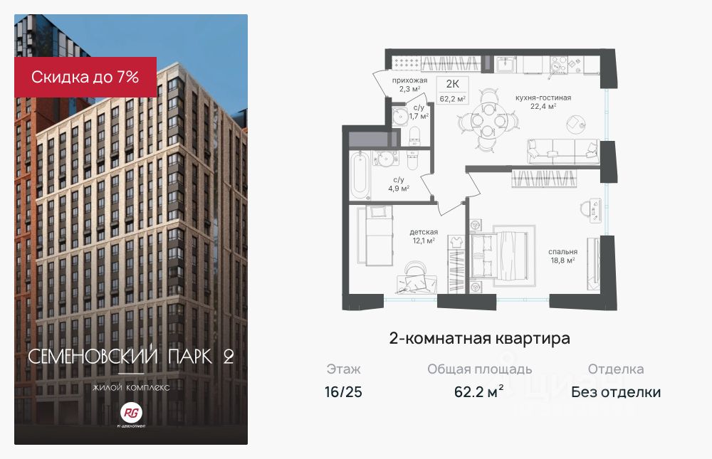 Продается 2-к квартира 62,2 кв.м. в ЖК "Семеновский парк 2" на 16-м этаже 25 этажного дома.