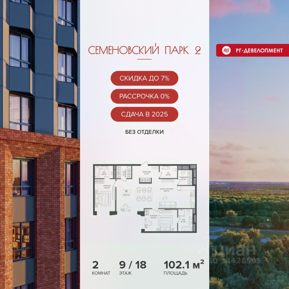 Продается 2-к квартира 102,1 кв.м. в ЖК "Семеновский парк 2" на 9-м этаже 18 этажного дома.