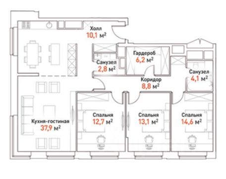 Об апартаментах: 3 спальни, просторная кухня-гостинная, совмещенный и раздельный с/у.