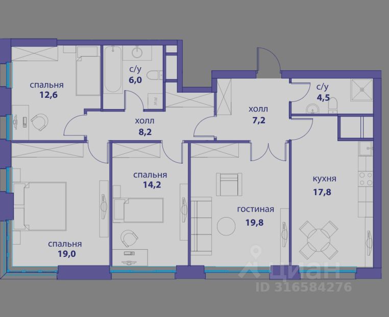 О квартире: 4 изолированные комнаты, кухня, 2 с/у (совмещенный и раздельный).