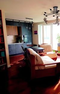Гостиная объединена с кухней и прихожей - общая площадь 34 кв.м. Перепланировка узаконена в 2020 г. В гостиной панорамные окна "в пол" шириной 3,8 м.
