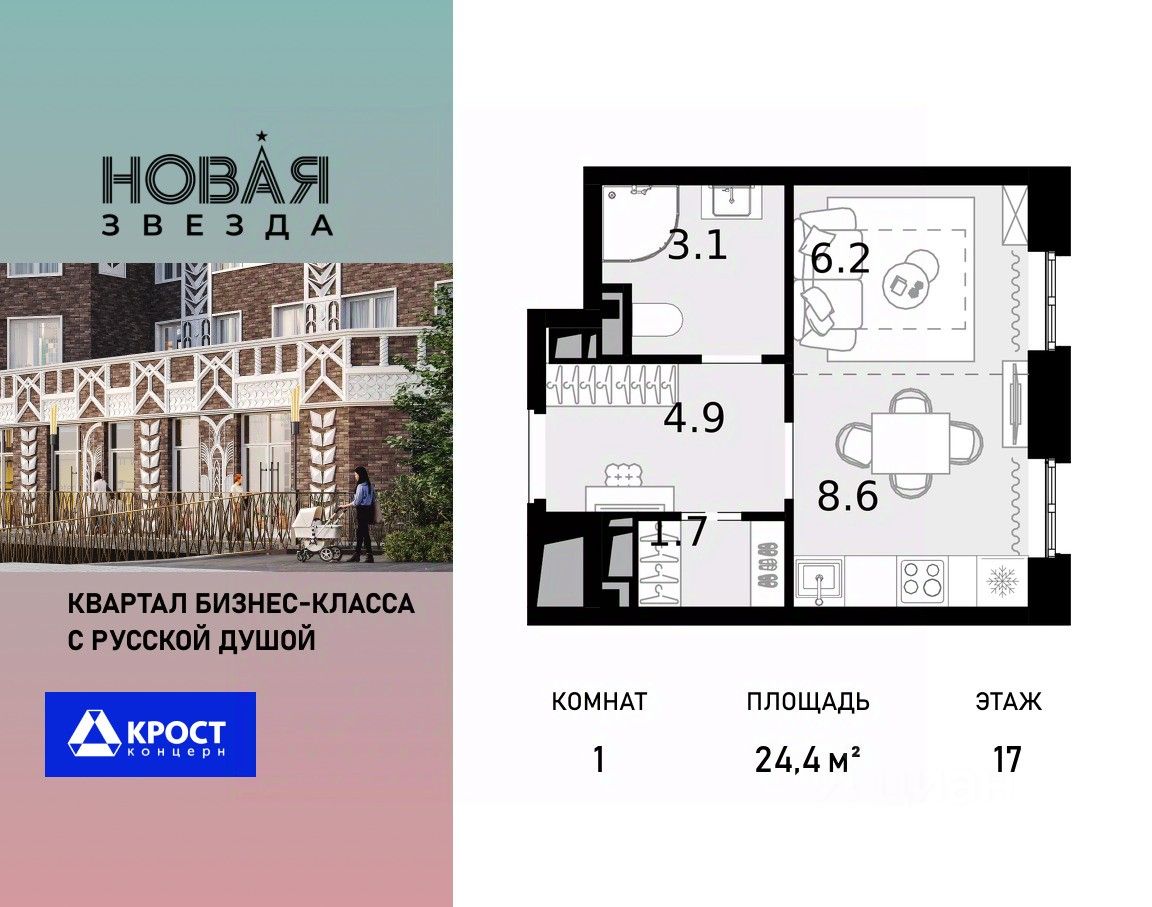 Продаётся 1-к квартира 24.4 кв.м. на 17-м этаже 22 этажного дома, корпус 6 - Резиденция "Хабаровск". Без отделки.