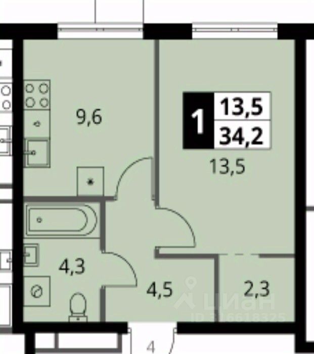 Большая кухня - 9,6 м2, жилая комната -13,5 м2
