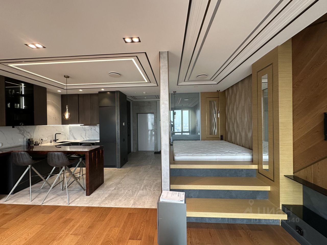 Продаю видовую студию на 46-м этаже вместе с машиноместом и кладовкой. На первом этаже здания расположено фойе, консьерж. Входные двери первого этажа оборудованы системой доступа, установлен видеодомофон. Один взрослый собственник. Площадь апартаментов - 42.4м2 Площадь кладовки - 3,4 м2 Площадь машиноместа - 15,2м2 Квартира: Дизайнерский ремонт, с использованием дорогих отделочных материалов: Полы - дерево, керамогранит. Стены - керамогранит, дерево, 3D гипсовые панели, ГКЛ с окраской. Потолок - многоуровневый, из ГКЛ с окраской. Межкомнатные двери-невидимки высотой 2,5 метра. В квартире выполнена полная шумоизоляция стен, полов, потолков, и входной двери, что обеспечивает максимальную тишину и изоляцию от шума соседей. Два больших окна в пол с моторизированными шторами. Панорамным вид на север Москвы. Кухня с барной стойкой, выполнена на заказ. Встраиваемая бытовая техника Bosch, Neff, Liebherr. Осмос для приготовления питьевой воды. Встроенный биокамин. Установлен кондиционер Daikin. Отдельная гардеробная комната, оборудованная системой хранения для одежды, с пространством для стирки и сушки вещей. Квартира оснащена системой защиты от протечек. Установлен мастер выключатель, благодаря которому, при выходе из квартиры перекрывается вся вода и обесточивается вся квартира, кроме критичных потребителей. Такая система позволяет хозяину не думать, что осталось включенным в розетку, и где не закрыта вода в доме, добавляет комфорта и обеспечивает безопасность, пока хозяина нет дома. Совмещенный санузел с большой душевой без поддона и затемняющимся стеклом Smart Glass. Встраиваемая сантехника Ghroe. По всей площади квартиры выполнен теплый пол с автоматической, зонированной регулировкой температуры в помещениях. Установлены дополнительные вытяжки для лучшей вентиляции помещения. Установлен электрический водонагреватель для комфортного пользования во время сезонных отключений ГВС. Выполнена подготовка под систему видеонаблюдения и охранную сигнализацию (без установки активного оборудования). Вся мебель и техника остается. Кладовка: Выполнен ремонт. Установлена функциональная система хранения. Яркое освещение для удобства пользования. Машиноместо: Широкое машиноместо под большой джип, расположено около лифта. Соседнее машиноместо удалено техническим разрывом, что позволяет очень комфортно парковаться.