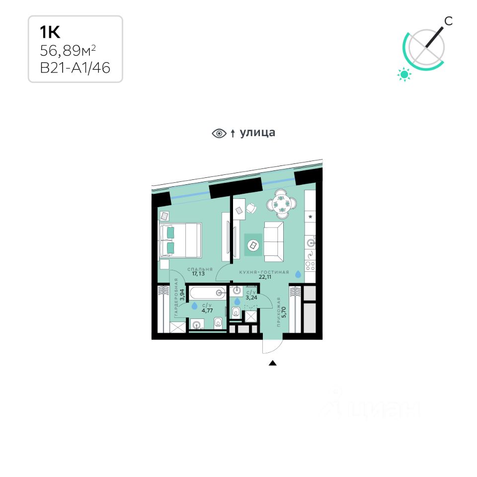 В продаже — однокомнатная квартира с чистовой отделкой, общей площадью 56,89 кв. м. Квартира расположена на десятом этаже одинадцатиэтажной секции корпуса класса Адвансд в новом районе СберСити, который строит Сбер. Дом находится на второй береговой линии Москвы-реки.