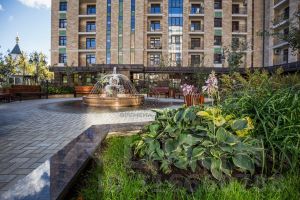 Фасад жилого комплекса "GRAND DELUX на Плющихе" отделан природным камнем. Основание дома оформлено плитами натурального гранита и массивными архитектурными элементами из камня.