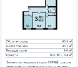 Трехкомнатная квартира в серии 515/9Ш, только в этом варианте серии трехкомнатные квартиры имеют вид распашонки с выходящими на разные стороны дома окнами. В комнате, которая выходит на заднюю часть дома, имеется лоджия в форме трапеции.