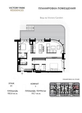 Эксклюзивное предложение с террасой 54,7 кв.м. Квартира с отделкой! Вид в красивый тихий двор Victory Park Residence. Просторная зона кухни-столовой-гостиной. Две спальни каждая со своим с/у, гостевой с/у. Панорамные окна. Высота потолков 3,6м. Квартира с ОТДЕЛКОЙ в стиле нетфактура. Площадь квартиры 102,6 кв.м.