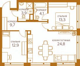 Площадь квартиры - 68.7 кв.м. Кухня 24.2 кв.м