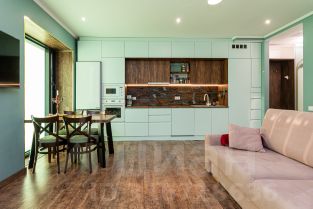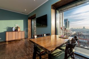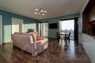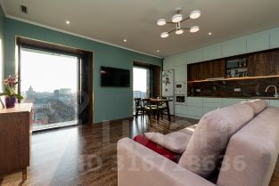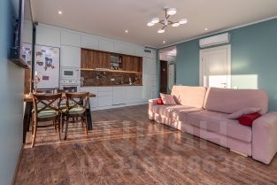 Планировка квартиры включает кухню, совмещенную с гостиной (27 кв.м.), две спальни, два туалета и прихожую. Из гостиной открывается вид на закат, из спален - на центр. Вся мебель остается, квартира полностью готова к проживанию. Выполнен качественный дизайнерский ремонт, никаких вложений не требуется.