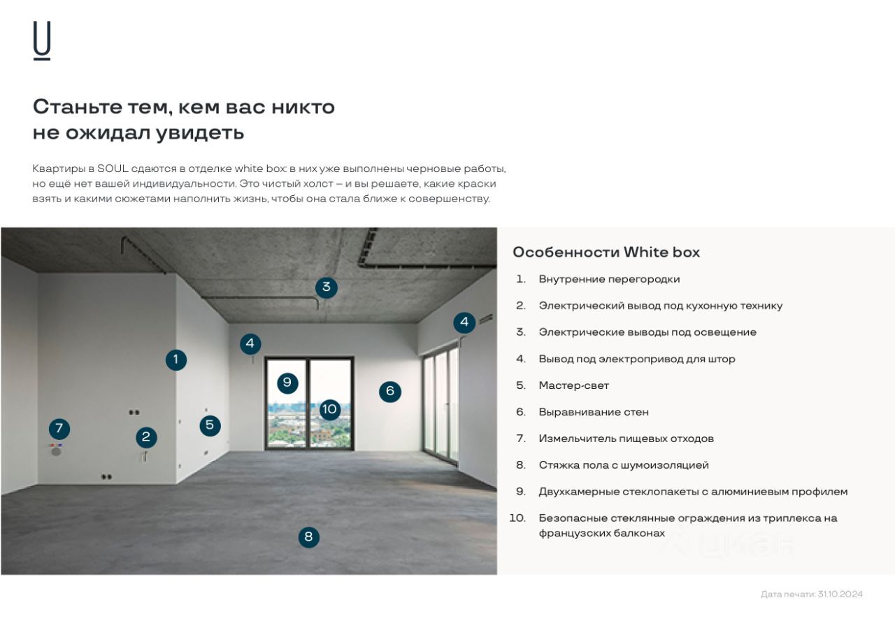Отделка White Box: звукоизоляция полов, подготовка стен под финишную отделку, удобная разводка инженерных сетей, включая ТВ, интернет, и кондиционирование. Подведена система отопления, установлены пожарные датчики, продумана вентиляция. Система дренажа для кондиционеров, централизованная вытяжная система — для максимального комфорта и чистоты воздуха.