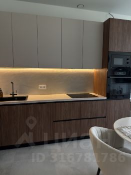 Лаконичная функциональная кухня укомплектована холодильником, варочной панелью, духовым шкафом, вытяжкой, встроенной Микроволновой печью и посудомоечной машиной, а также великолепной обеденной группой с точечным освещением.