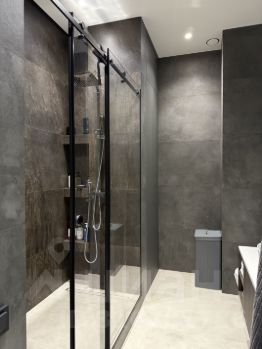 Напольное покрытие выполнено из широкоформатного керамогранита, установлена система электрических Теплых полов по всей площади квартиры, гребенка в санузле, качественные натяжные потолки, большое разнообразие сценариев освещения.