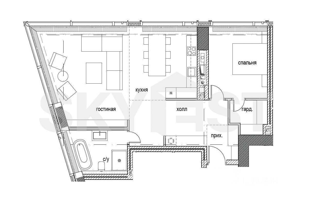 Планировка: кухня-гостиная, спальня, ванная комната, гостевой санузел.