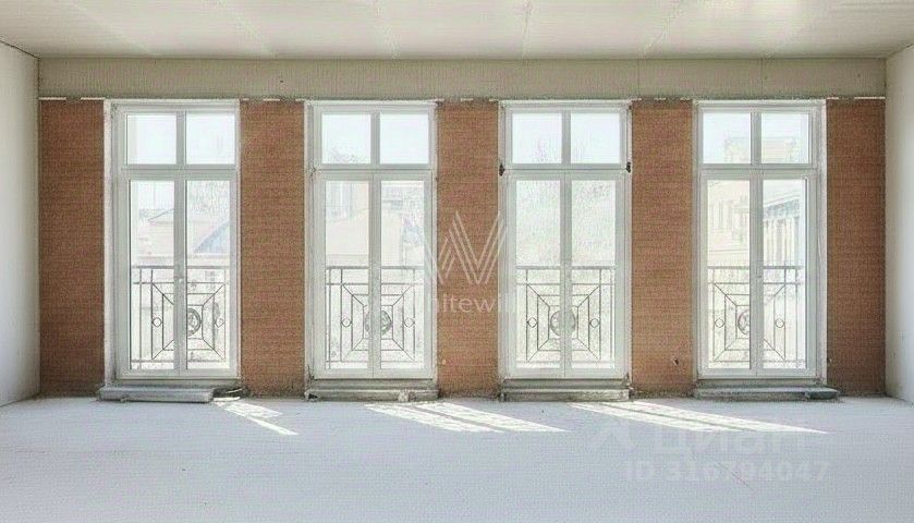 Гостиная со вторым светом и высокими окнами от пола до потолка, большое количество естественного света. Высота потолка достигает 7,1 метра.