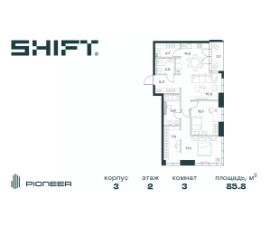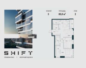 3-к квартира в премиальном комплексе SHIFT на 2-м этаже в 18 этажном здании. Общая площадь 85.8 кв. м.