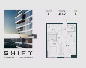 1-к квартира в премиальном комплексе SHIFT на 2-м этаже в 18 этажном здании. Общая площадь 46.9 кв. м.