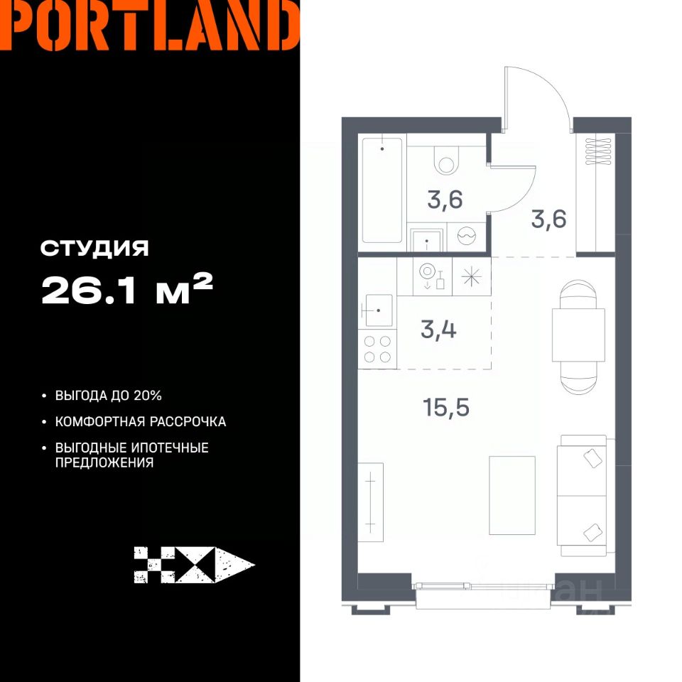 Продаётся студия, 5 этаж в жилом комплексе бизнес-класса Portland от девелопера FORMA. ЖК расположен на берегу Москвы-реки в северной части района Печатники в акватории Южного речного порта.