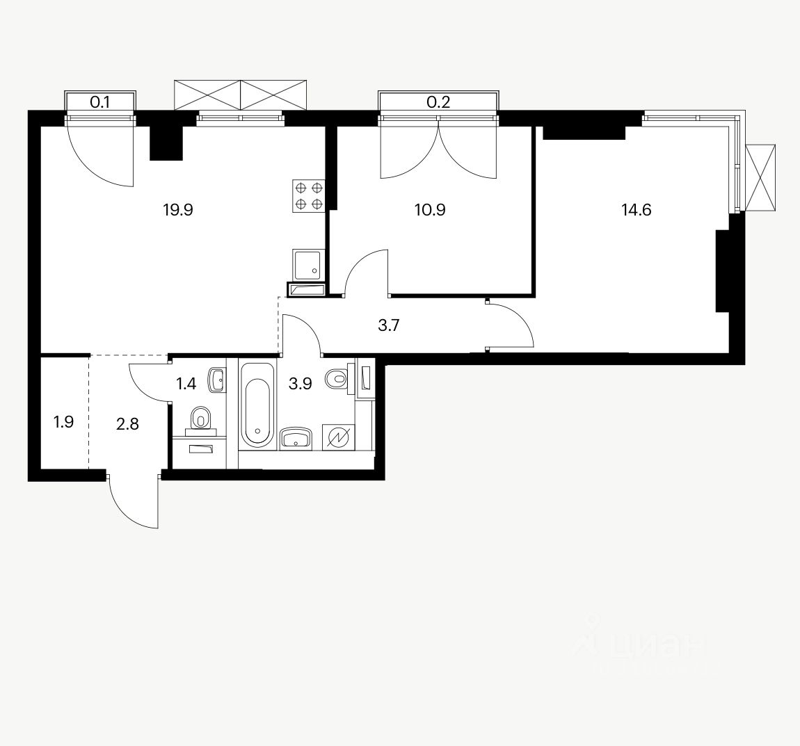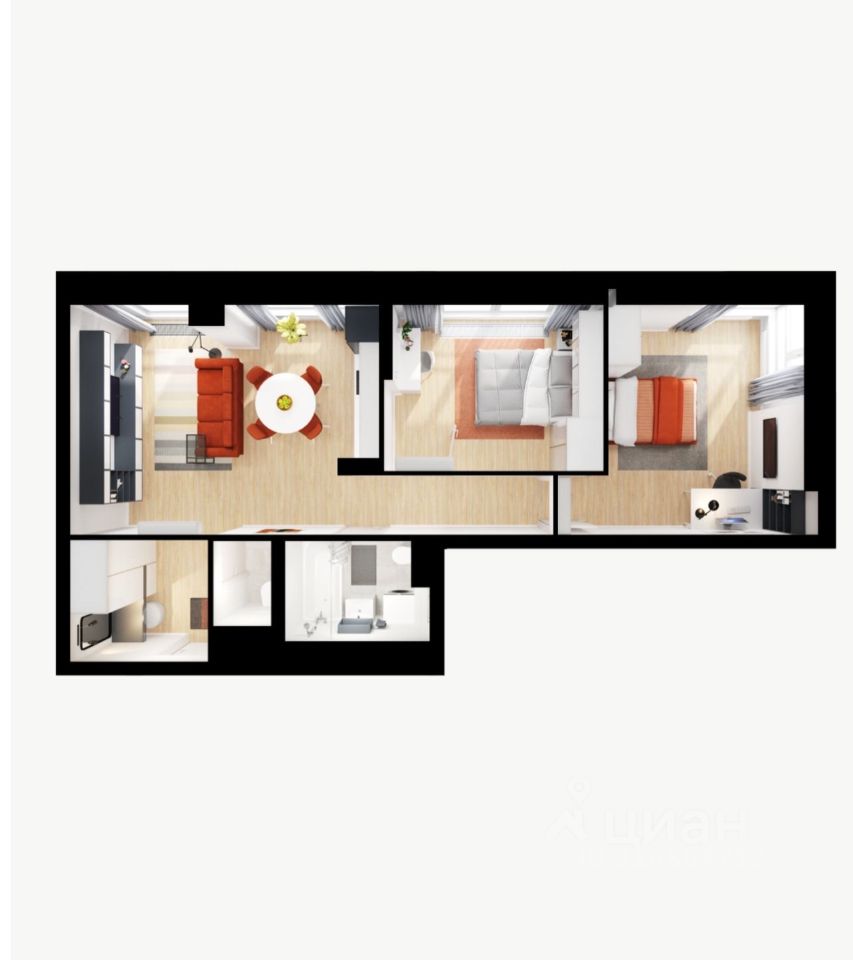 Планировка идеально продумана для комфортной жизни: большая кухня-гостиная, две изолированные комнаты, два совмещённых санузла, просторная прихожая с местом под систему хранения, два французских балкона, делающих квартиру светлее и просторнее, а также открывающих вид на город.