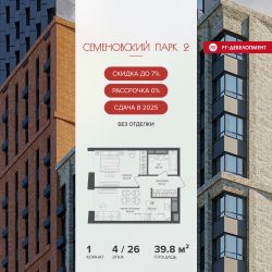 Продается 1-к квартира 39,8 кв.м. в ЖК "Семеновский парк 2" на 4-м этаже 26 этажного дома.