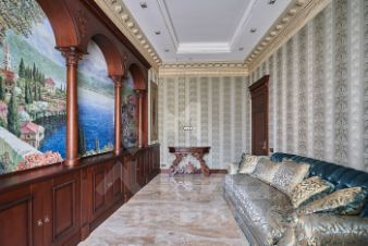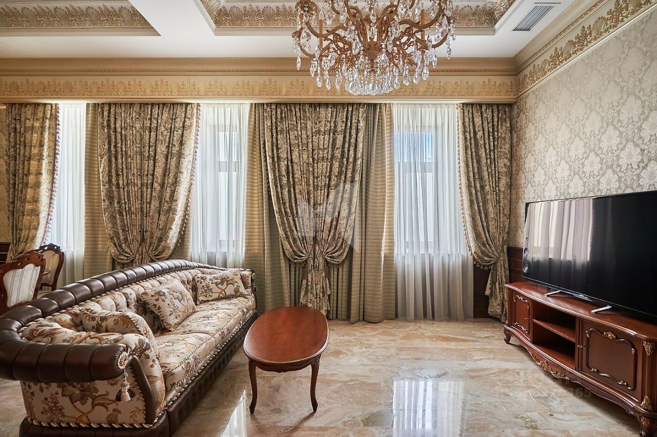 Интерьеры оформлены в изысканном классическом стиле с использованием импортных материалов: натуральный оникс, благородный мрамор, гипсовая лепнина, мебель из массива дуба и ореха от итальянских производителей. Хрустальные люстры и светильники от фабрики Schonbek придают помещению неповторимый шарм.